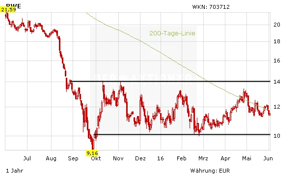 Seit September vergangenen Jahres pendelt die RWE-Aktie bereits im breiten Seitwärtstrend zwischen zehn und 14 Euro. Derzeit notiert der Titel knapp unterhalb der 200-Tage-Linie. Diese verläuft bei 11,75 Euro. Erst mit dem Ausbruch über diese Marke würde ein neues Kaufsignal generiert. Dann wäre eine neue Attacke auf die obere Begrenzung möglich.