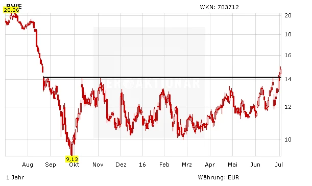 Mit dem Sprung über den massiven horizontalen Widerstand bei 14,00/14,10 Euro hat die RWE-Aktie ein neues Kaufsignal generiert. Aus charttechnischer Sicht wartet der nächste Widerstand erst bei 18,50 Euro.