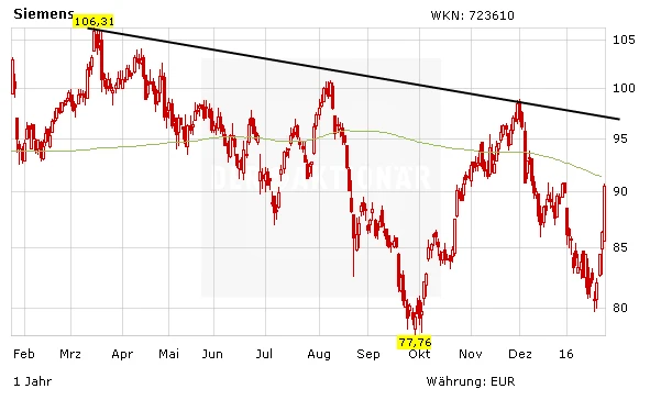 Die Bekanntgabe der Quartalszahlen und die Prognose-Erhöhung verleiht der Siemens-Aktie am Dienstag Rückenwind. Mit einem Kursplus von mehr als acht Prozent ist das Papier an die DAX-Spitze gestürmt. Erweist sich der Ausbruch als nachhaltig, dürften bald die 200-Tage-Linie bei 91,26 Euro sowie der mittelfristige Abwärtstrend im Bereich von 97,50 Euro in den Fokus rücken. DER AKTIONÄR rät Anlegern, vor dem Neueinstieg ein charttechnisches Kaufsignal abzuwarten.