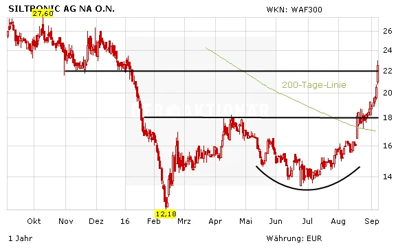 Mit dem optimistischen Ausblick und den Übernahme-Gerüchten gelang es den Papieren von Siltronic, die wichtige 200-Tage-Linie zu überwinden. Zudem konnte der massive Widerstandsbereich bei 22,00 Euro geknackt werden. Das Kursplus beläuft sich seit Anfang August auf über 40 Prozent. Spekulative Anleger, die mittelfristig auf ein Übernahmeangebot setzen, sollten dennoch einen Rücksetzer in Richtung der Signallinie abwarten.