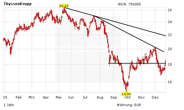 Der Industrie-und Stahlkonzern ThyssenKrupp war seit dem Zwischenhoch bei gut 20 Euro deutlich unter Druck gekommen. Nach der Bodenbildung oberhalb der 17-Euro-Marke hat die Aktie durch den Sprung über 17,81 Euro nun ein erstes Lebenszeichen gesendet, wenngleich sowohl der kurz- als auch der mittelfristige Abwärtstrend weiterhin intakt sind.