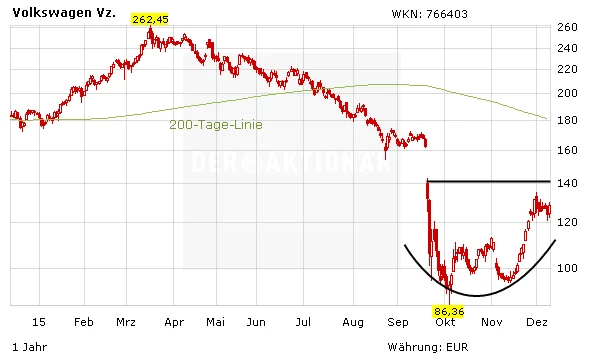 DER AKTIONÄR bleibt bei seiner laufenden Einschätzung für die VW-Aktie: Auf Sicht von 12 bis 24 Monaten weist das Papier durchaus ein interessantes Chance-Risiko-Verhältnis auf. Trotzdem bleibt die Ungewissheit über den Schaden, den der Abgas-Skandal letztlich in der Bilanz des Autobauers hinterlassen wird. Die Volatilität auf absehbare Zeit wird aber hoch bleiben. Zudem lauert vor der Aktie mit der unteren Begrenzung der Kurslücke bei 142,90 Euro ein hartknäckiger Widerstand. Erst wenn diese Marke fällt, würden Charttechniker vom Abschluss der Bodenbildung sprechen. Der Favorit in der Branche bleibt die Aktie von Daimler.