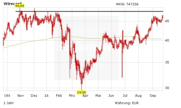 Im ansonsten eher schwachen Gesamtmarkt ist die Wirecard-Aktie daraufhin zweitweise an die Spitze im TecDAX geklettert. Zudem knüpft die Aktie nach einem kurzen Durchhänger zur Monatsmitte nun an ihr Erholung an. Investierte Anleger lassen die Gewinne laufen, das nächste Ziel ist das Allzeithoch bei 48,78 Euro.