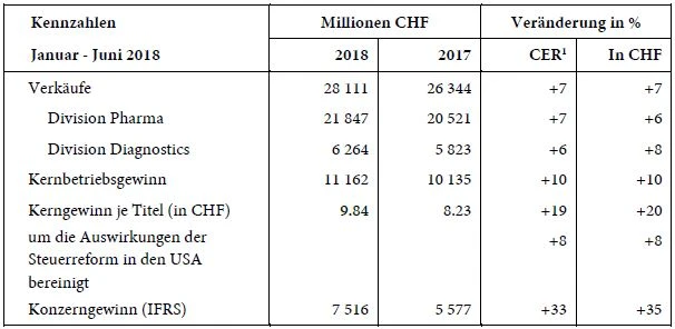Der Schweizer Pharmakonzern Roche hat nach einem starken ersten Halbjahr mit einem erneut erhöhten Ausblick für das Gesamtjahr überrascht. Wie das Unternehmen am Donnerstagmorgen mitteilte, stieg der Umsatz zu konstanten Wechselkursen von Januar bis Juni im Vergleich zur entsprechenden Vorjahresperiode um sieben Prozent auf 28,1 Milliarden Franken. Dabei steuerte die Geschäftssparte Pharma 21,8 Milliarden bei (+7 Prozent), der Bereich Diagnostics 6,3 Milliarden (+6 Prozent) bei. Der Kernbetriebsgewinn kletterte um zehn Prozent auf 11,2 Milliarden Franken. Der Kerngewinn je Aktie erhöhte sich um 19 Prozent auf 9,84 Franken.