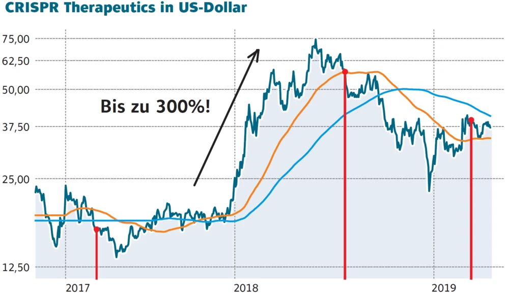 Die CRISPR-Fantasie war Anfang 2018 ungebrochen, mutige AKTIONÄR-Leser konnten nach etwas Geduld knapp 200 Prozent Gewinn einstreichen (Erstempfehlung am 26. April 2017 bei 15,28 Euro, ausgestoppt bei 45,00 Euro Mitte 2018). Derweil hat DER AKTIONÄR vor wenigen Wochen erneut spekulativen Anlegern geraten, eine Langfrist-Position einzugehen. Ein Stopp bei 24,50 Euro ist jedoch Pflicht!