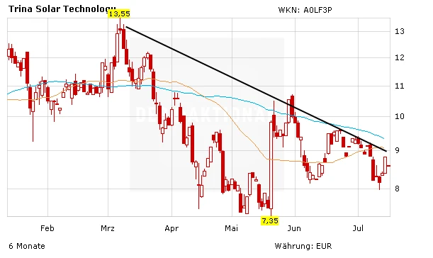 Charttechnisch besteht die Chance, dass Trina durch die WTO-News über den eingezeichneten Abwärtstrend springt. Noch liegt das Papier aber unter wichtigen Durchschnittslinien.