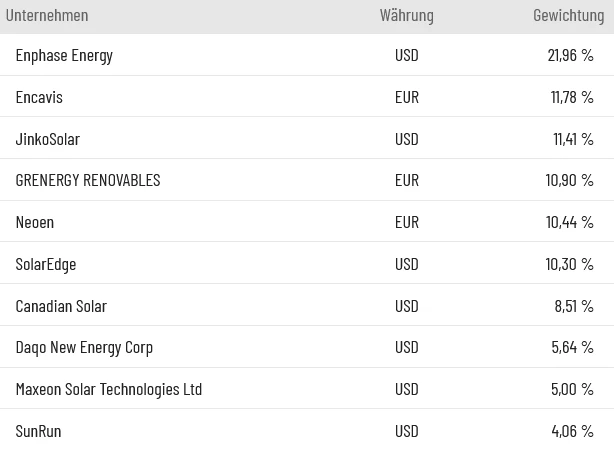 Der Clou: Sunrun ist Mitglied im Solar Top 10 Index. Darüber hinaus umfasst der sorgsam ausgewählte Aktienkorb weitere neun internationale Top-Player mit starker Markposition und bildet damit die gesamte Wertschöpfungskette der Branche ab.