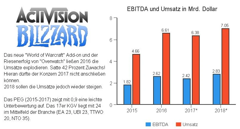 Laut den Marktforschern von Newzoo wächst der Gaming-Markt in diesem Jahr um rund sieben Prozent auf 107 Milliarden Dollar. Treibende Faktoren sind die Verbreitung von immer leistungsstärkeren Smartphones, die sich hervorragend zum Spielen eignen, sowie E-Sports, dessen Übertragungen inzwischen 131 Millionen Menschen verfolgen. Activision hat sich durch die Übernahme des großen Mobile-Entwicklers King Digital für 5,9 Milliarden Dollar sowie zahlreiche wettbewerbsfähige Games wie „Call of Duty“ und „Overwatch“ für diese Gaming-Trends top aufgestellt.