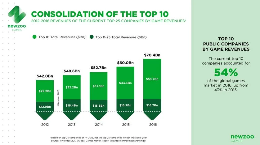 Vom wachsenden Markt profitieren insbesondere die großen Player. Neben Activision Blizzard sind hier die anderen AKTIONÄR-Empfehlungen Electronic Arts, Sony, Tencent, Take-Two und Nintendo zu nennen. Die Top 10 steigerten ihre Umsätze im vergangenen Jahr durchschnittlich um 24 Prozent. Zum Vergleich: Das Wachstum des Gesamtmarkts lag 2016 mit 8,5 Prozent wesentlich darunter.