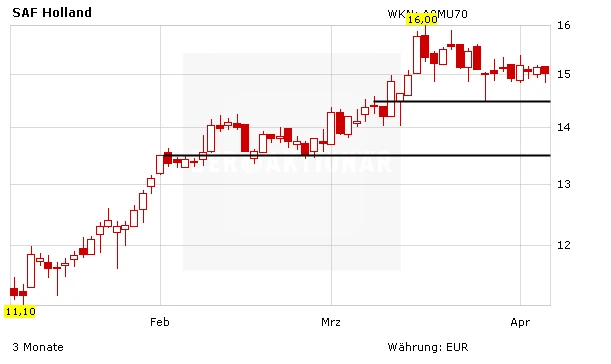 Die SAF-Aktie hat seit Jahresbeginn bereits rund 40 Prozent zugelegt. Der Aufwärtstrend verläuft bei 14,50 Euro und massive horizontale Unterstützungen gibt es im Bereich um 13,50 Euro. Mit einem 2015er-KGV von 13 und einer Dividendenrendite von 3,3 Prozent versuchen Anleger, die mittelfristig an einer Trendfortsetzung teilhaben wollen, gestaffelt an diesen Marken Position zu beziehen.