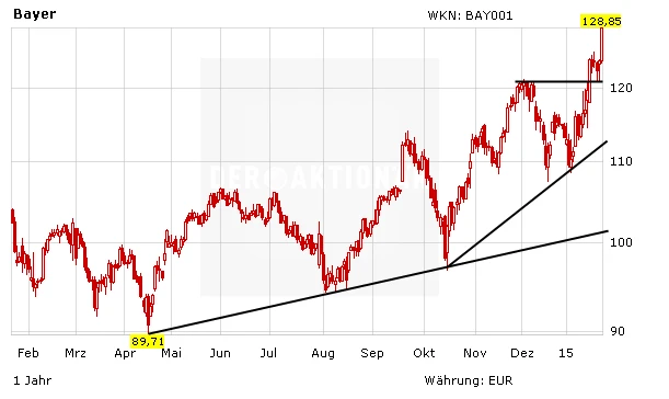 Analyst Alistair Campbell hat das Kursziel für Bayer von 123 auf 130 Euro angehoben und die Einstufung auf „Buy“ belassen. Europäische Pharmakonzerne dürften auch 2015 mit der Marktzulassung einiger Blockbuster rechnen. Allerdings sollte sich auch der Preisdruck der Vorjahre fortsetzen. Die Branchengrößen seien insgesamt nicht mehr billig, aber angesichts guter mittelfristiger Gewinnaussichten auch noch nicht teuer. Im Sektorvergleich sieht Campbell Bayer neben Novartis als Top-Pick.