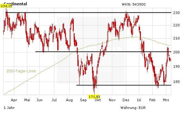 Zu Jahresbeginn war Continental noch deutlich unter Druck geraten. Über 20 Prozent hatte der Autozulieferer an Wert verloren. Inzwischen geht der Blick aber wieder nach oben. An der unteren Begrenzung des breiten Seitwärtstrends bei 180 Euro ist die Trendwende gelungen. Der horizontale Widerstand bei 200 Euro ist nun die einzige massive Hürde auf dem Weg in Richtung des Allzeithochs bei 234,15 Euro.