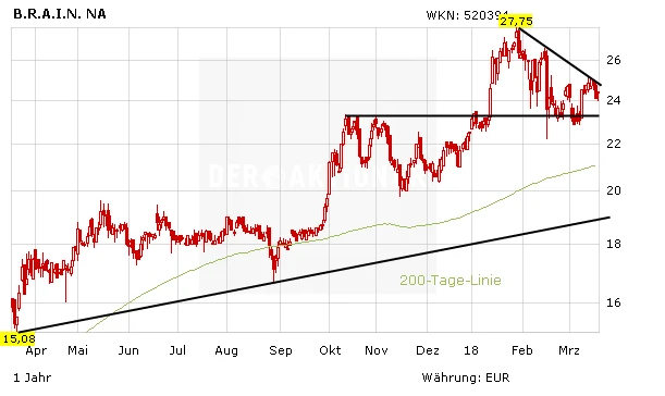 Vom geplanten Mehrheitserwerb der Firma Biocatalysts kann die BRAIN-Aktie bis dato nicht profitieren. Fakt ist: Die Zwingenberger haben sich in einem äußerst attraktiven und lukrativen Markt verstärkt. Sollten die Konditionen passen, zu denen BRAIN zum Zuge gekommen ist, dürfte die Aktie auch wieder anziehen. In einer ersten Reaktion auf die Verstärkung im Segment Bioindustrial hat die Baader Bank die Kaufempfehlung mit einem Zielkurs von 24,00 Euro für die Papiere bestätigt. DER AKTIONÄR bleibt langfristig vom Biokönomie-Titel überzeugt. Investierte Anleger bleiben an Bord.