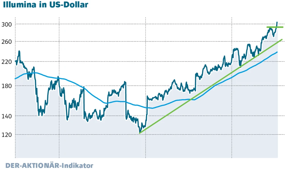 Die Illumina-Aktie ist nach dem fulminanten Anstieg prädestiniert für eine Konsolidierung. Über 300 Dollar sollten Anleger ein paar Gewinne mitnehmen, die AKTIONÄR-Empfehlung liegt über 70 Prozent im Plus. Langfristig sollten die NovaSeq-Technologie und der Newsflow rund um GRAIL den Papieren weiteren Auftrieb verleihen können.