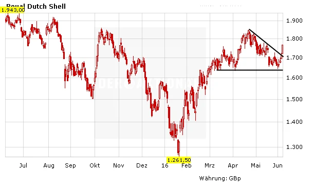 Die starke Kursentwicklung der Ölpreise hat natürlich auch die Aktienkurse des Öl- und Gasproduzenten Royal Dutch Shell zuletzt erheblich beflügelt. Im gestrigen Handel glückte dem Aktienkurs des britisch-niederländischen Mischkonzerns dadurch der Ausbruch aus dem kurzfristigen Abwärtstrend.