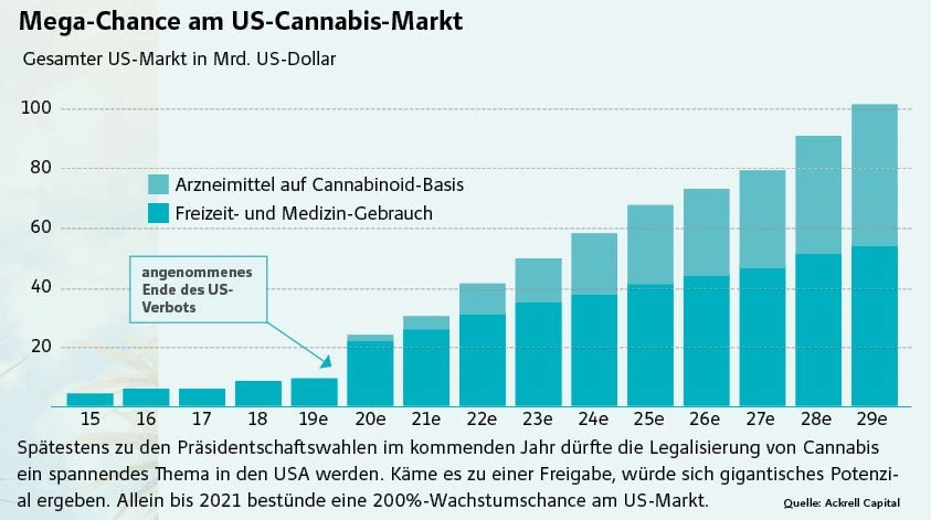 Große Hoffnungen der Cannabis-Unternehmen ruhen darüber hinaus aber insbesondere auch auf Europa, hier im Speziellen auf Deutschland, und natürlich auf den USA. In den Staaten hat sich das politische Umfeld zuletzt erheblich verbessert. Hier würde sich ein Multi-Milliarden-Markt auftun. Piper-Jaffray-Analyst Michael Lavery glaubt, dass die Legalisierung von Marihuana bei den US-Präsidentschaftswahlen 2020 ein heißes Thema werden könnte, wenn nicht schon zuvor Änderungen an den geltenden Bundesgesetzen vorgenommen wurden.