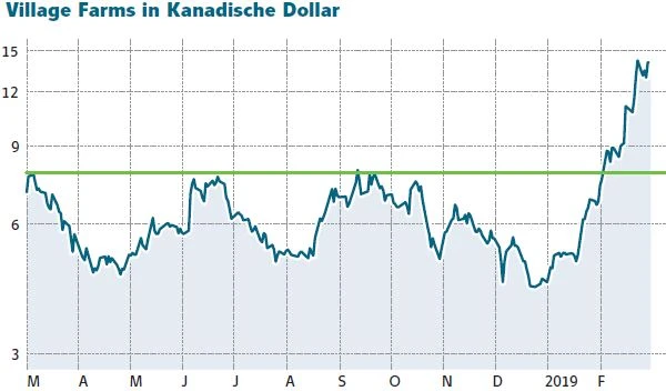Zuletzt hat Village Farms die Genehmigung für zwei weitere Areale erhalten, die es komplett allein nutzen kann. Nun kann man Village Farms sicher nicht direkt mit Canopy vergleichen. Canopy hat sich eine zu starke weltweite Position erarbeitet. Doch selbst mit einem deutlichen Abschlag ergäbe sich für Village Farms noch ein Vervielfachungspotenzial. Zumal Village Farms auch kein unbeschriebenes Blatt ist. Das Unternehmen hat sich als Spezialist für Obst- und Gemüseanbau einen Namen gemacht. Seit 30 Jahren ist es am Markt, zuletzt erzielte es einen Umsatz von rund 210 Millionen Kanadischen Dollar.