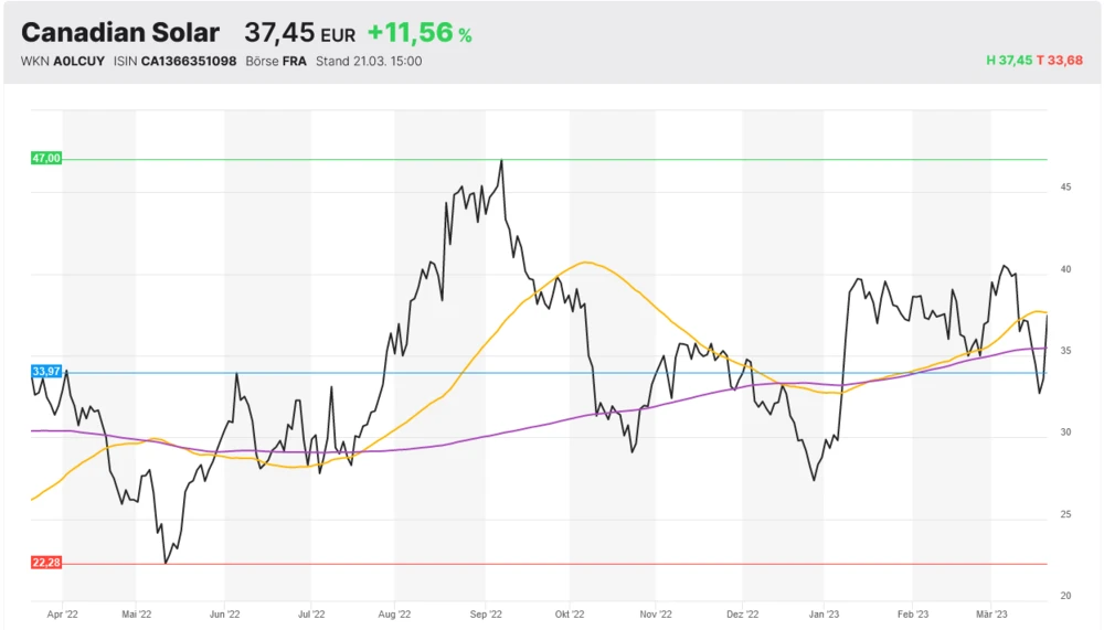 Canadian Solar, ein in Kanada ansässiges Solar- und Batterie-Unternehmen, legt am Dienstag knapp 12 Prozent zu. Hintergrund sind die heute veröffentlichen Unternehmenszahlen zum vierten Quartal. Das Unternehmen meldete einen bereinigten Gewinn von 1,11 US-Dollar je Aktie, bei einem Umsatz von 1,97 Milliarden Dollar. Analysten erwarteten lediglich einen Gewinn von 0,70 Dollar je Aktie bei einem Umsatz von 1,92 Milliarden Dollar. Die Lieferung von Solar-Modulen stiegen im Vergleich zum Vorjahres-Zeitraum um knapp 68 Prozent.