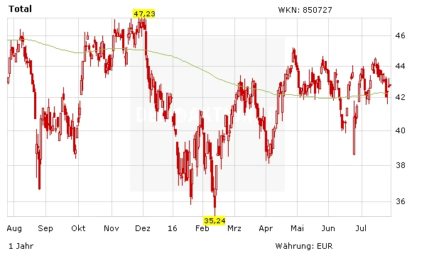 Zusammen mit Shell (heute allerdings mit schwachen Zahlen) bleibt die Aktie von Total der Favorit im Energiesektor. Der Konzern ist sehr gut positioniert und auch in der Lage, im aktuell schwierigen Marktumfeld hochprofitabel zu bleiben. Die Bewertung der Aktie ist immer noch günstig und die Dividendenrendite hoch. Der Stoppkurs sollte bei 35,00 Euro belassen werden.