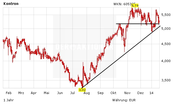 Kontron legt seit einem halben Jahr eine Rallye aufs Parkett. Im Zuge der monatelangen Aufwärtsbewegung geriet die Aktie des Minicomputerherstellers nur im Oktober einmal unter Druck. Nach einer kurzen Verschnaufpause kletterte der Titel dann bis auf das aktuelle 12-Monats-Hoch bei 5,79 Euro.