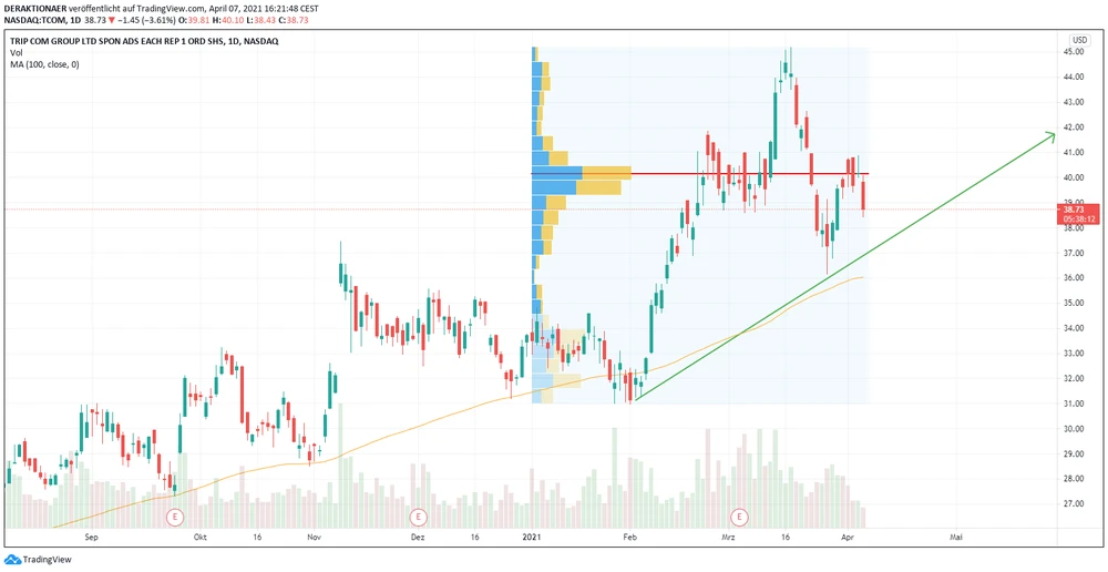 Die anschließenden Gewinnmitnahmen um fast 20 Prozent fanden ihr Ende wieder am GD100 bei 36,15 Dollar. Ausgehend von diesem Tiefpunkt erholt sich das Wertpapier seit Ende März. Aktuell pendelt die Aktie um den sogenannten Point-of-Control (PoC) bei 40 Dollar (rote Linie). Auf diesem Level gab es seit Jahresanfang die meisten Transaktionen. Die Anleger bewerten den Preis somit als fair.