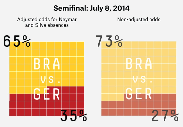 Beim Halbfinal-Spiel gegen Deutschland sieht Silver die Brasilianer als klaren Favoriten, ihre Siegchance liegt bei 65 Prozent. Selbst das Ausscheiden von Neymar und der Ausfall des gelbgesperrten Silva haben an der Favoritenposition Brasiliens wenig geändert. Mit Neymar und Silva wäre Brasilien sogar mit 73 Prozent Favorit gegen das deutsche Team gewesen.