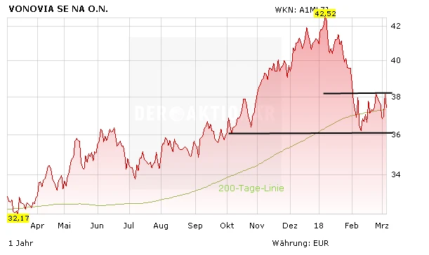 Während die Papiere des Immobilienkonzerns bis Anfang 2018 ordentliche Kurszuwächse verzeichnen konnten, kam kurz darauf der Fall unter die wichtige 200-Tage-Linie. In den letzten Wochen bewegte sich die Aktie im Bereich 36 bis 38 Euro. Im Fokus steht eine mögliche Zinswende, welche die Anleger weg von dem soliden Geschäft mit Immobilien-Aktien wie Vonovia locken könnte. Dennoch könnte sich die Aktie des Bochumer Konzerns, begleitet von einem positiven Newsflow um die Buwog-Übernahme, wieder in Richtung 42,00 Euro entwickeln.