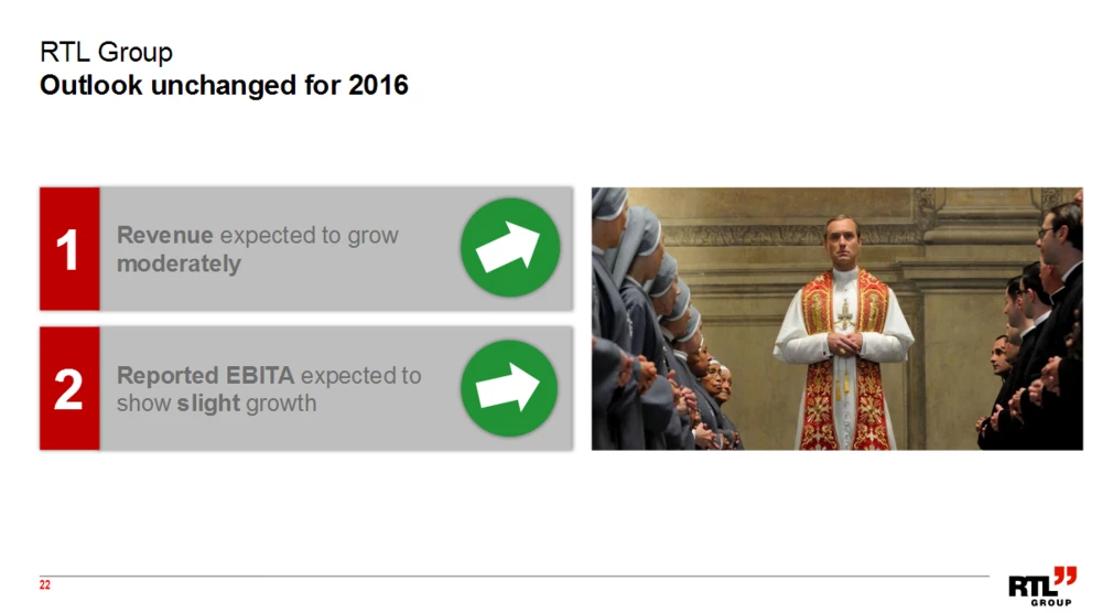 Der konzerneigene Content-Produzent Freemantle Media hinkt der Vorjahresperformance dagegen etwas hinterher. Trotzdem hat RTL sowohl für diese Sparte, als auch für den gesamten Konzern die Jahresprognose bestätigt. Der Umsatz soll demnach moderat um 2,5 bis 5,0 Prozent steigen, beim EBITA wird ein leichter Zuwachs um 1,0 bis 2,5 Prozent angestrebt.