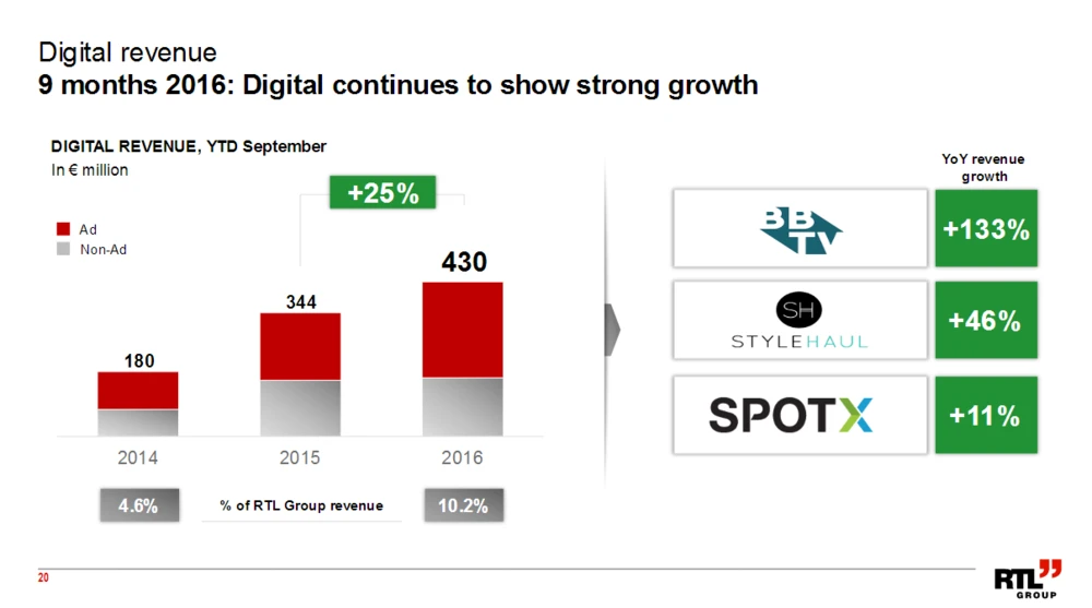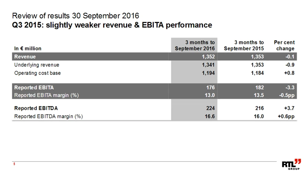 RTL hat am Donnerstagmorgen seinen Zwischenbericht für das dritte Quartal veröffentlicht. Im traditionell schwächsten Vierteljahr meldete der Medienkonzern stagnierender Umsätze von 1,35 Milliarden Euro und einen rund dreiprozentigen EBITA-Rückgang auf 176 Millionen Euro. Seit Jahresbeginn steht aber sowohl beim Erlös, als auch beim operativen Ergebnis ein Plus zu Buche.