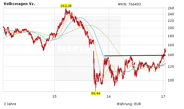 Das VW-Papier hatte nach der Einigung mit den US-Behörden stark zugelegt. Da war der kurze Rücksetzer nicht verwunderlich. Wird die Marke von 148,14 Euro überwunden - das Tief aus dem Monat Oktober 2014 - lautet das nächste Etappenziel 158,38 Euro. Das Tief aus dem Monat September 2015. Damit wäre dann auch gleichzeitig das Gap geschlossen. mAnleger versuchen mit einem Abstauberlimit bei 143,00 Euro und 140,50 Euro zum Zug zu kommen.