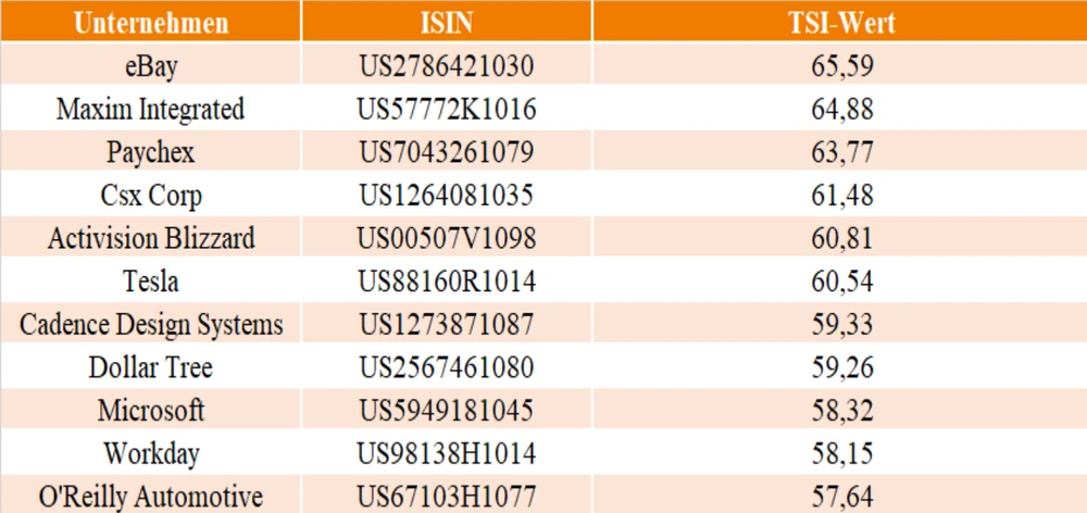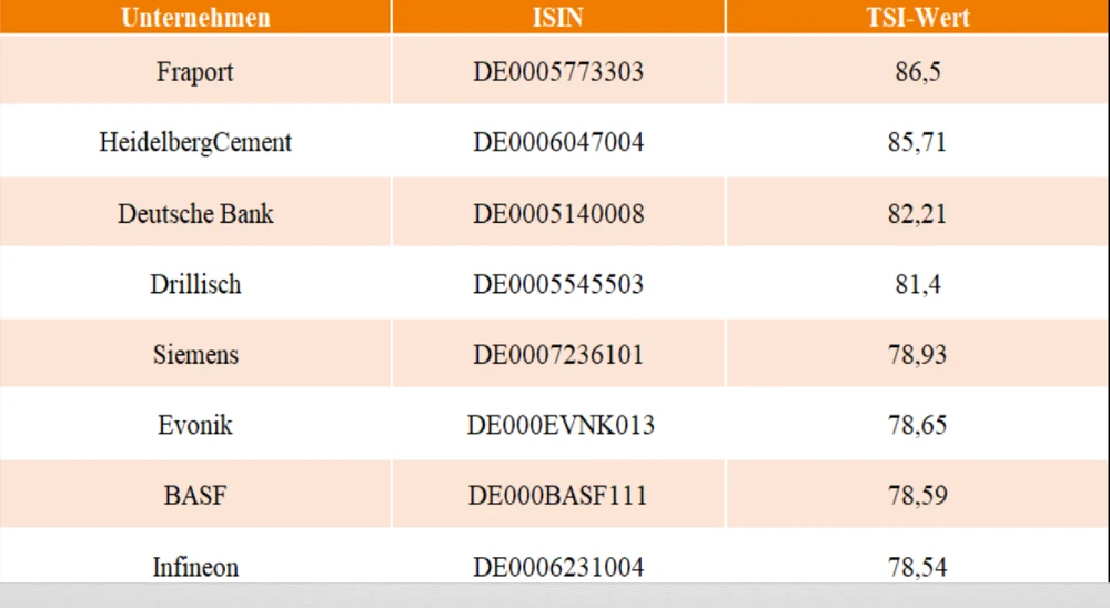 TSI-Werte größer 80 sorgen für eine Aktienaufnahme in den Fonds. Diese Voraussetzung schafften zuletzt Halbleiter-Hersteller Intel, das chinesische Reiseportal Trip.com und das Medien-Unternehmen Fox. Aus dem HDAX - bestehend aus DAX, MDAX und TecDAX - wurden Deutsche Bank, Fraport und Heidelberger Zement neu in den Patriarch Classic TSI-Fonds (WKN: HAFX6Q) aufenommen.