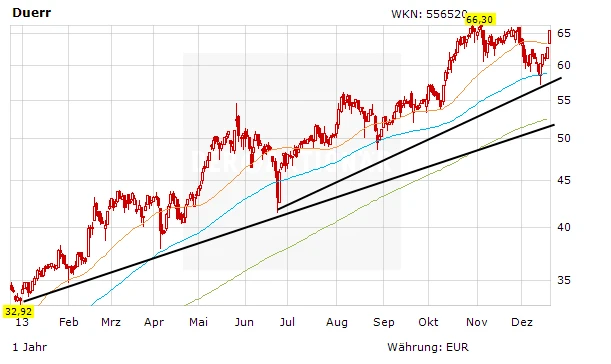 Die Aktie von Dürr läuft in einem mustergültigen Aufwärtstrend weiter nach oben. Das Papier ist mittlerweile bei knapp 64 Euro angekommen. Damit nicht genug, die Analysten sehen noch weiteres Potenzial für Dürr.