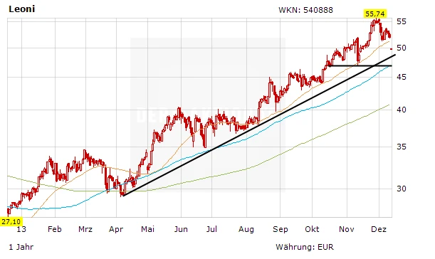 In den letzten Tagen hat die Leoni-Aktie deutlich korrigiert. Vom Hoch bei 55,74 Euro ging es am Donnerstag gar bis 49,70 Euro nach unten. Knapp darunter verläuft der seit April 2013 bestehende Aufwärtstrend. Spätestens von diesem Niveau aus (48,50 Euro), sollte die Aktie wieder nach oben drehen!