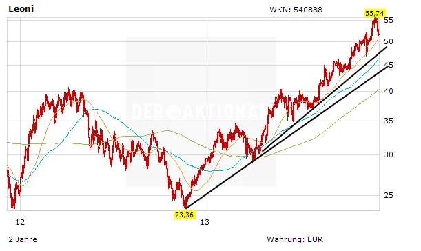 Im Zuge des schwachen Gesamtmarktes ist die Leoni-Aktie in den letzten Tagen unter Druck geraten. Vom Hoch hat das Papier bis auf rund 51,70 Euro korrigiert. Damit hat die Aktie die 38-Tage-Linie erreicht. Sofern die Korrektur anhält, dient der kurzfristige Aufwärtstrend bei rund 48,00 Euro als nächste Unterstützung.