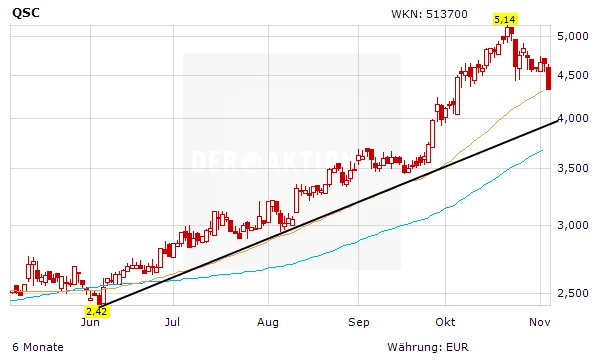 Die kommenden Tage dürften volatil bleiben. Investierte Anleger bleiben aber dabei. Schließlich sind die fundamentalen Voraussetzungen gut. QSC will bis 2016 einen Umsatz zwischen 800 Millionen und einer Milliarde Euro erwirtschaften. Derzeit erlöst das Team um Vorstand Bernd Schlobohm knapp 455 Millionen Euro.
