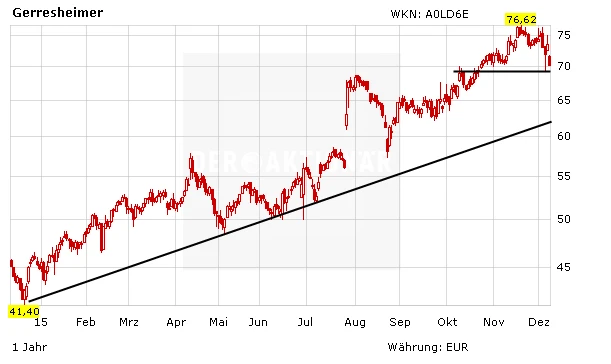Erstmals seit dem 21. August ist die Börsenampel in den vergangenen Tagen von rot auf grün umgesprungen. Das hatte zur Folge, dass der ShortDAX-ETF aus dem TSI-Musterdepot als seit langem einzige Position verkauft und durch neun trendstarke Werte ersetzt wurde. Mit einem TSI-2.0-Wert von 92,3 Prozent wanderte auch der MDAX-Titel Gerresheimer zu einem Kurs von 71,90 Euro ins Portfolio. Dieser steht nun mit einem kräftigen Minus am Indexende.