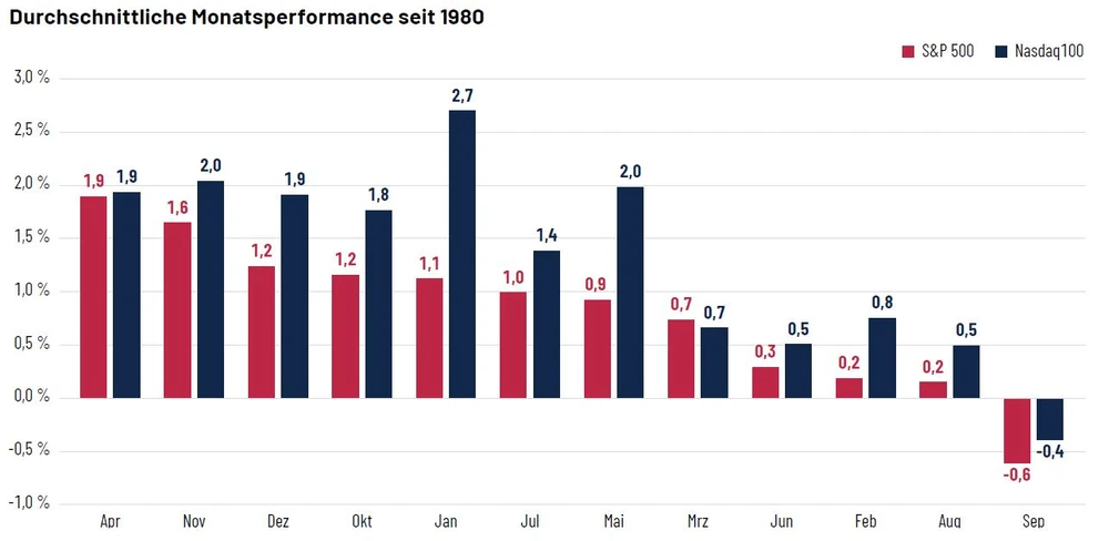 Beim Blick auf die durchschnittliche monatliche Performance fällt in der Tat auf, dass die großen US-Indizes seit 1980 (Nasdaq 100 seit Februar 1985) in den letzten drei Monaten des Jahres überdurchschnittlich gut performten. Während der Nasdaq 100 beispielsweise im Durchschnitt um 1,3 Prozent pro Monat stieg, fällt die Performance mit zwei Prozent im November und 1,9 Prozent im Dezember signifikant besser aus. Lediglich der Januar erweist sich mit einer Rendite von 2,7 Prozent historisch noch besser als der November. Beim S&P 500 zeigt sich ein ähnliches Bild: Hier liegen die drei letzten Monate des Jahres sogar unter den Top 4 des Rankings.