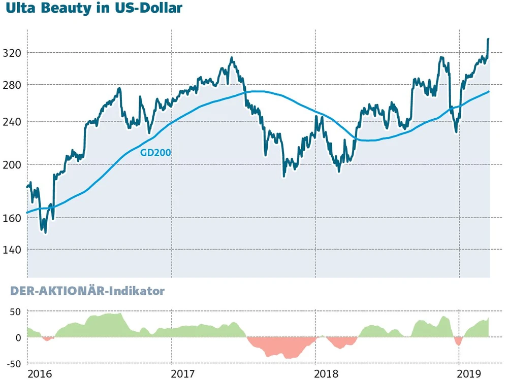 Auch zuletzt konnten wieder einige Aktien des TSI-Fonds ihren Aufwärtstrend beschleunigen. Vor allem fundamentale Daten gaben hierbei Rückenwind. So auch bei Ulta Beauty. Der Konzern konnte im vierten Quartal des Geschäftsjahres 2018 solide Ergebnisse bekanntgeben. Der Gewinn in diesem Zeitraum beläuft sich auf 3,61 Dollar je Aktie und verbesserste sich im Vergleich zum Vorjahresergebnis um 31,3 Prozent. Analysten hatten nur mit einem Gewinn von 3,56 Dollar je Aktie gerechnet. Der Umsatz des Kosmetik-Einzelhändlers wuchs um 9,7 Prozent auf 2,12 Milliarden Dollar.