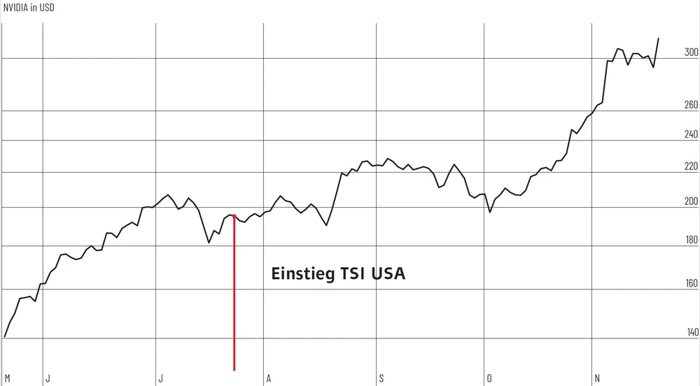 Nvidia ist für TSI USA kein unbeschriebenes Blatt. Das System von TSI USA ist bereits frühzeitig auf Nvidia aufmerksam geworden. Das erste Mal wurde die Aktie des Grafikchip- und KI-Spezialisten im Jahr 2016 gekauft. Am Ende blieb ein satter Gewinn von mehreren hundert Prozent übrig. Das frische Kaufsignal wurde Ende Juli ausgelöst. Das Timing war perfekt. Die Aktie konnte in den letzten Monaten die Aufwärtsbewegung deutlich beschleunigen.