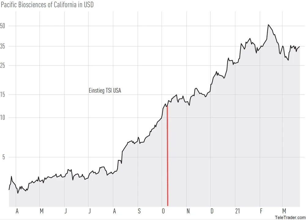 Zu den Gewinnern der vergangenen Handelswochen zählt unter anderem Pacific Biosciences of California. Seit dem Bewegungstief Anfang März hat die Aktie gut 40 Prozent an Wert zugelegt und notiert derzeit an einer wichtigen charttechnischen Marke. Gelingt der Ausbruch über den Widerstand, sollte es wieder zügig Richtung altes Hoch gehen. Aus TSI-Sicht ist bei der Aktie alles in bester Ordnung. Der TSI-Wert liegt mit 92 Prozent im absoluten Top-Bereich – das Kaufsignal ist also völlig intakt. Der Buchgewinn von Pacific Biosciences of California beläuft sich trotz der Korrektur immer noch auf über 160 Prozent.