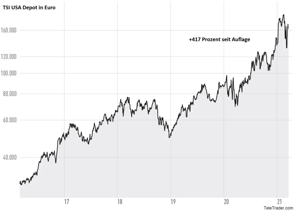 Techwerte standen zuletzt nicht hoch in der Gunst der Anleger. Das TSI USA Depot hat den Tech-Abverkauf relativ gut verkraftet und notiert knapp unter dem Allzeithoch. Der perfekte Zeitpunkt um einzusteigen. Zumal viele Depotaktien aktuell Schwung holen und in den letzten beiden Wochen deutlich zweistellig zugelegt haben.