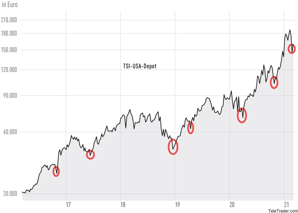 Seit Auflage vor exakt fünf Jahren sind bei TSI USA aktuell Gewinne von mehr als 350 Prozent aufgelaufen. Im Hoch notierte das Depot noch weit mehr im Plus. Die aktuelle Korrektur geht aber nicht spurlos an dem Portfolio vorbei. Für Neueinsteiger bietet der aktuelle Rücksetzer jedoch auch eine Chance. Die Historie zeigt, dass Drawdown-Phasen bei TSI USA nie von langer Dauer waren.