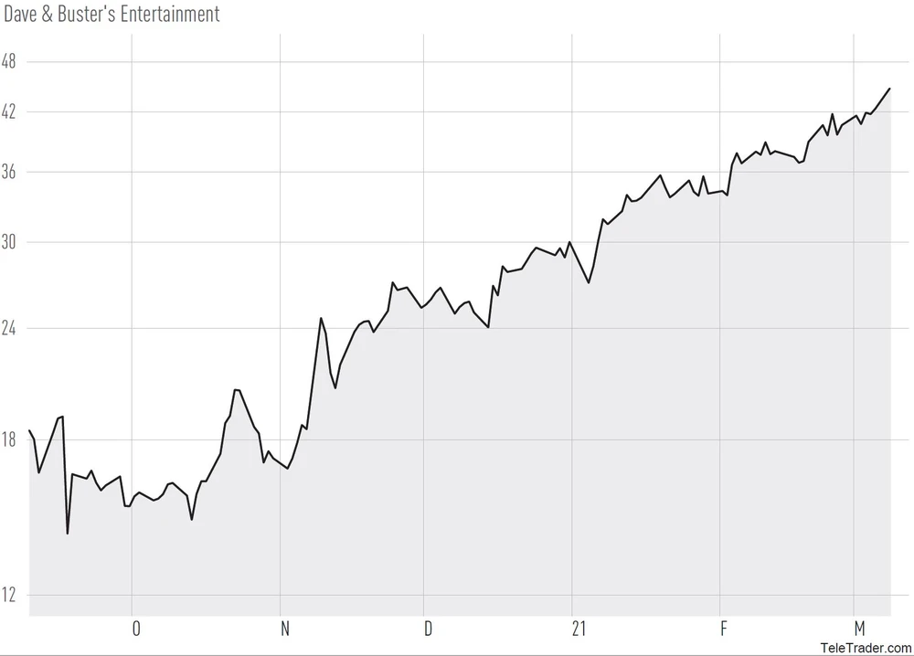 Dies bedeutet jedoch nicht, dass im MicroCap-Segement (zwischen 1,5 und 2 Millionen Dollar Marktkapitalisierung) keine Aktienperlen schlummern. Um diese Werte nicht vorzuenthalten, stellt TSI USA den Lesern seit der letzten Ausgabe nun auch noch eine MicroCap-Liste zur Verfügung. Wer es sich zutraut kann aus dieser Liste vortrefflich seine eigene Trandingstrategie entwickeln und die Challenge annehmen, die neue Apple, Amazon oder Tesla wirklich bereits in den Kinderschuhen zu entdecken und in das Depot zu legen – vielleicht schlagen Sie dann sogar die Performance des TSI USA Depots! Auf einer der vorderen Plätzen der MicroCap-Liste findet sich beispielsweise aktuell Dave&Buster`s Entertainment. Eine Aktie, die unabhängig der Gesamtmarktkorrektur von einem Hoch zum nächsten jagt!