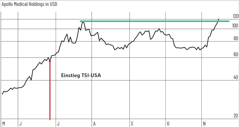 Im TSI USA Depot geht es Schlag auf Schlag. Eine Aktie nach der Anderen startet in die Jahresendrally. Am gestrigen Handelstag gelang Apollo Medical Group unter hohem Volumen der Ausbruch auf ein neues Allzeithoch. Für Rückenwind sorgen die guten Quartalzahlen.