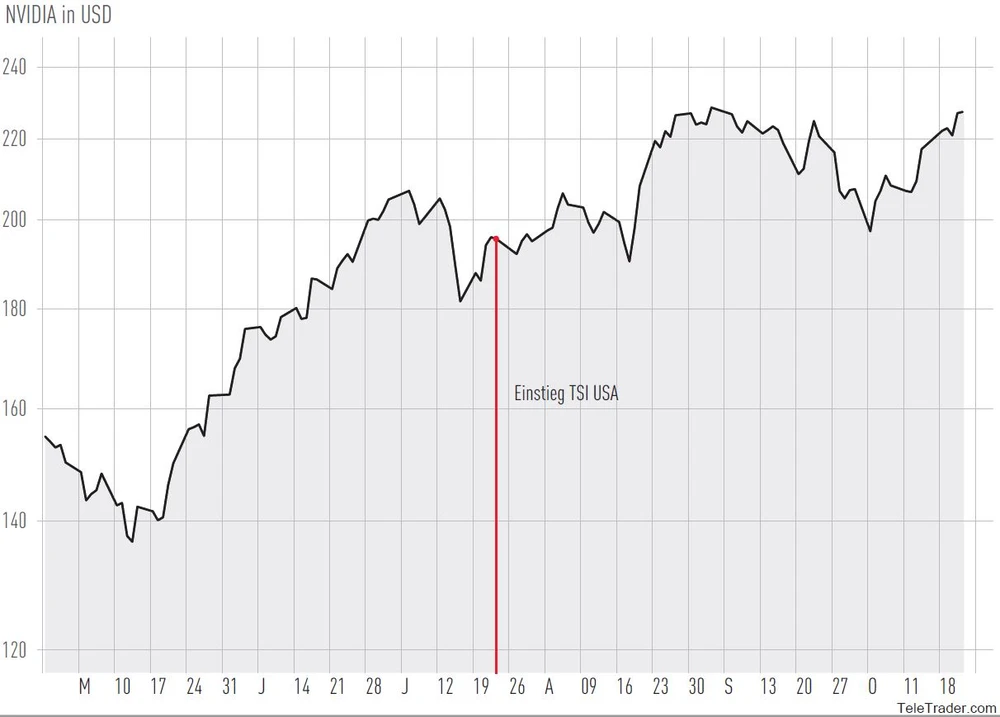 Das System von TSI USA ist bereits frühzeitig auf Nvidia aufmerksam geworden. Das erste Mal wurde die Aktie des Grafikchip- und KI-Spezialisten bereits im Jahr 2016 gekauft. Am Ende blieb ein satter Gewinn von deutlich über 200 Prozent übrig. Vor wenigen Wochen löste die Nvidia-Aktie ein neues Kaufsignal auf. Seitdem ist die Aktie bereits rund 20 Prozent in die Gewinnzone gelaufen.