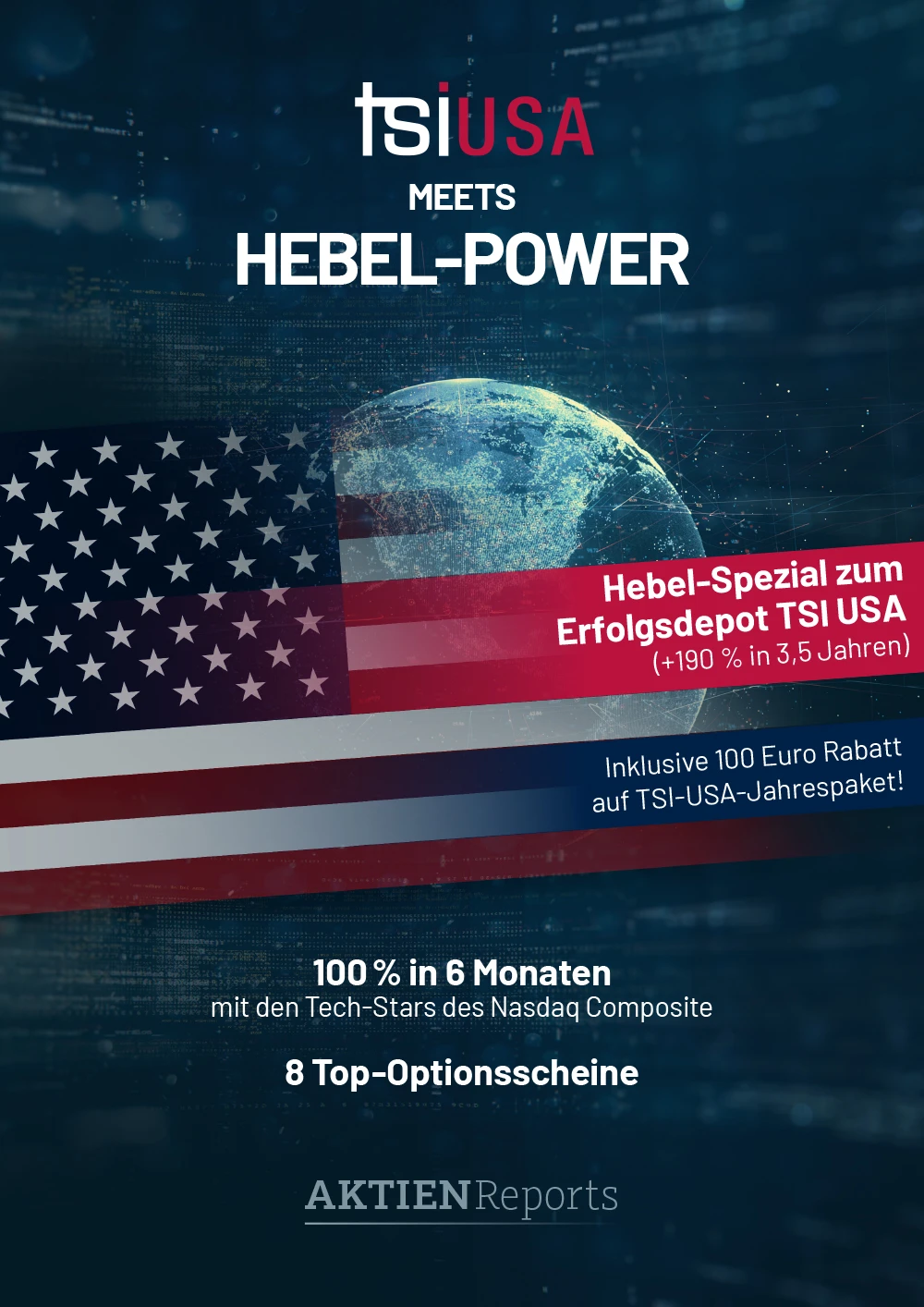 Mit dem vorliegenden Projekt wird versucht, alle Trümpfe des Systems auszuspielen. Der Trumpf für Sie: Wenn Sie sich bis zum 06. Dezember 2019 für ein TSI-USA-Abonnement entscheiden, erhalten Sie einen exklusiven Rabatt von 100 Euro auf das Abonnement. Alle Infos dazu werden im Report mitgeliefert.