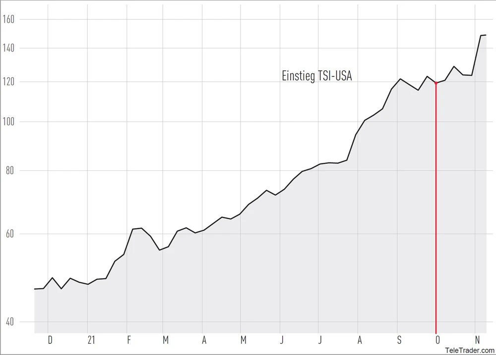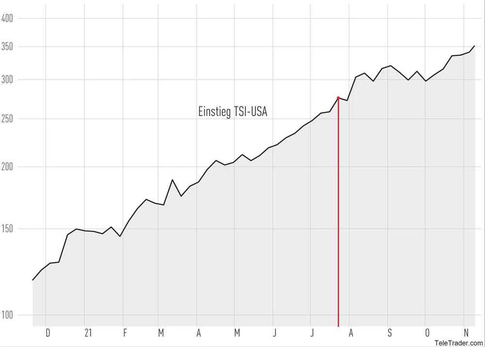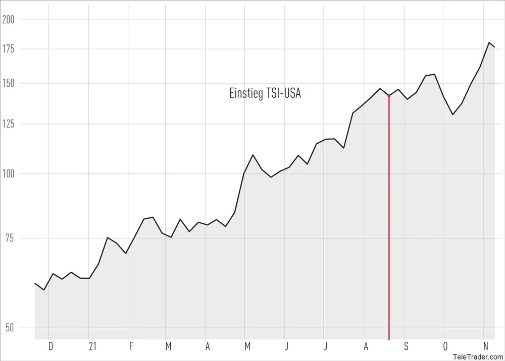 Die Jahresendrally ist in vollem Gange. Die US-Indizes notieren auf ihren Allzeithochs. In den vergangenen Tagen konnte auch das TSI USA Depot einen deutlichen Satz nach oben machen. Die TSI-Werte der Portfolioaktien liegen alle im grünen Bereich, die Aufwärtstrends sind also noch nicht ausgereizt und ein Einstieg ist jederzeit möglich.