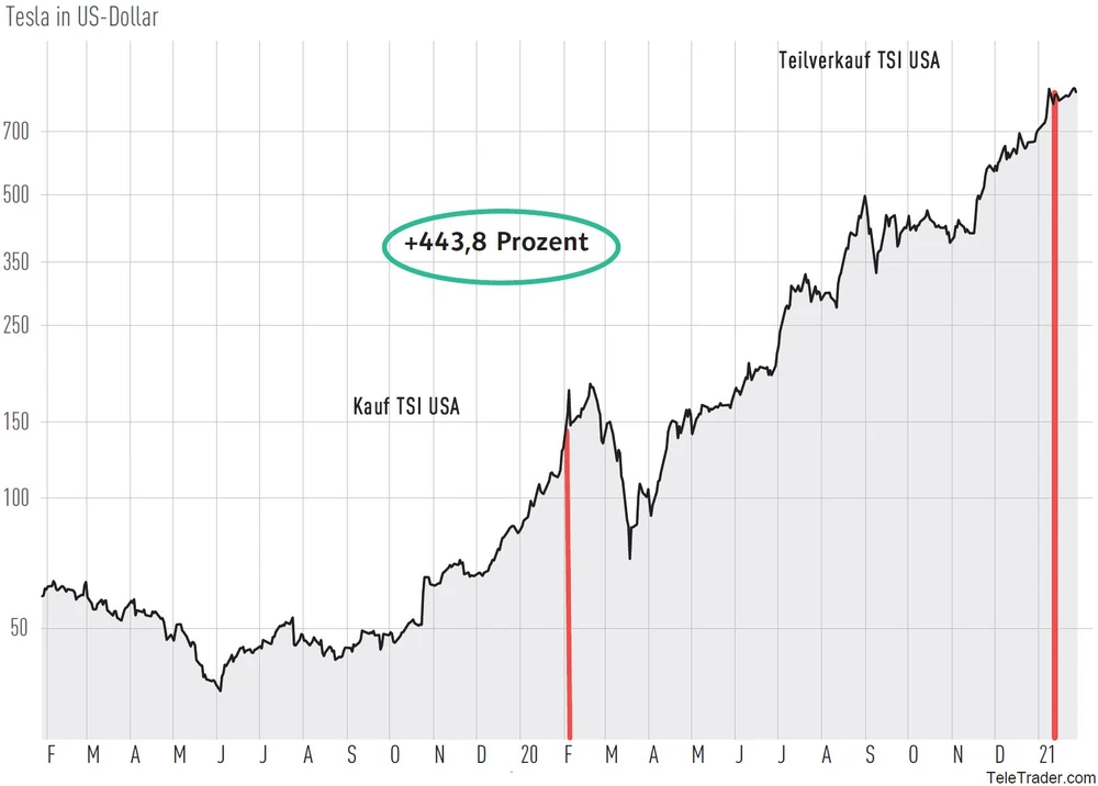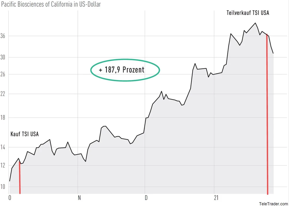 TSI USA setzt auf klar definierte Kaufsignale. Auch die Verkäufe unterliegen einem strikten Regelwerk. Bei heiß gelaufenen Aktien wird beispielsweise ab einer gewissen Positionsgröße ein Teil der Gewinne vom Tisch genommen. Bei Tesla und PacBio war das Timing der Verkäufe zuletzt hervorragend. Die realisierten Teilgewinne liegen deutlich im dreistelligen Bereich.