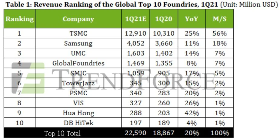 Zuletzt hat sich dieser Outsourcing-Trend aufgrund der technologischen Fortschritte der Automotive-Branche sogar verstärkt, wie nicht nur der Deal zwischen NXP und TSMC zur Herstellung eines 5nm-SoC aus dem Juni 2020 beweist. Die Marktforscher von Trendforce erwarten daher für TSMC einen Umsatzzuwachs von 25 Prozent im ersten Quartal.