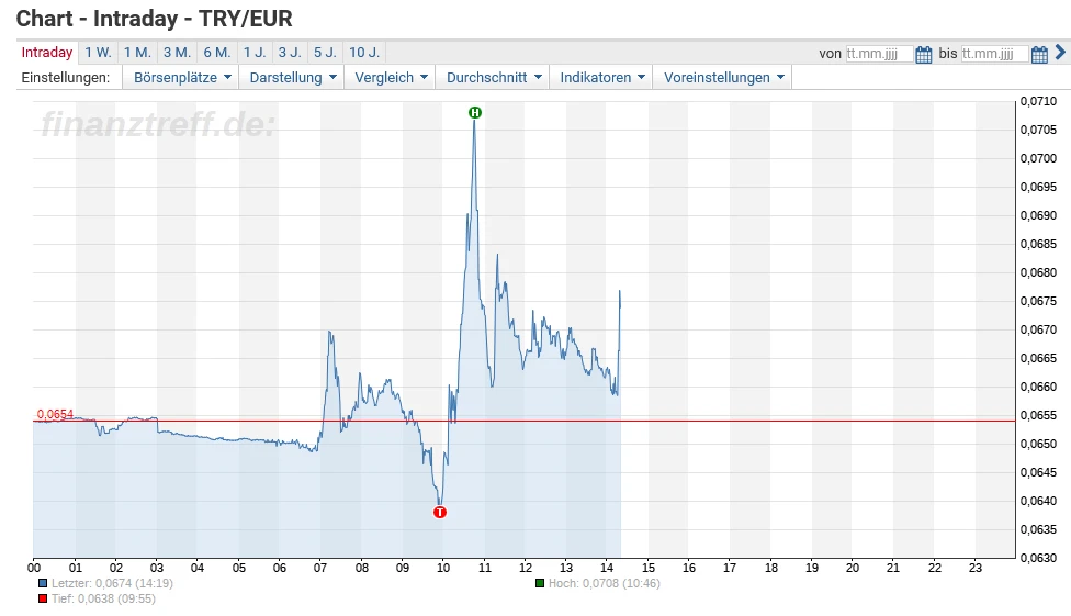Die Lage in der Türkei bleibt dramatisch: Der Lira-Kurs schwankt heute enorm, nachdem die türkische Notenbank zur Stützung der Landeswährung Lira am Devisenmarkt interveniert hat. Der Eingriff sei wegen einer „ungesunden Preisbildung“ am Markt erfolgt, teilte die Zentralbank mit. Viel helfen dürfte die Maßnahme nicht.